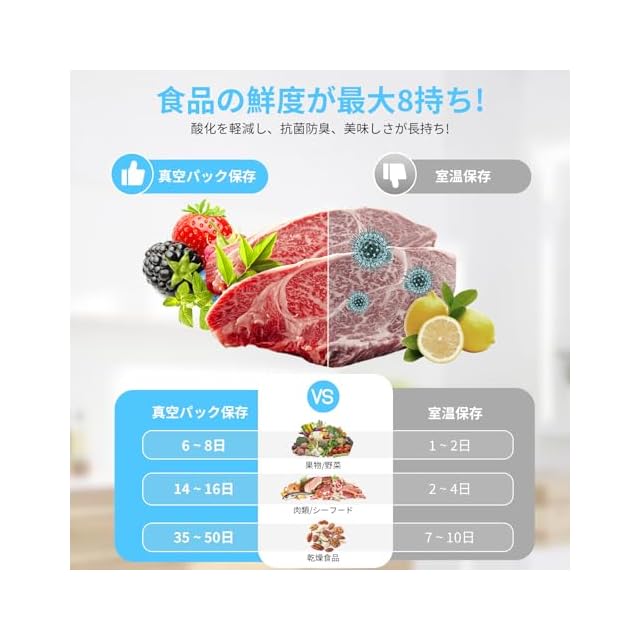 【90kpaの強力な吸引力&様々な食品に対応可能】真空パック機は先進的な真空技術が採用され、吸引力は最大約90kpaに達し、短時間で真空にすることができます。これには手動脱気、シールのみ、お米、汁物、乾物(ドライ物)の5つのモードが搭載されています。肉類、魚、野菜、果物などの食品の新鮮さを保つことができ、お菓子、ナッツなどの乾食品(ドライ食品)の真空保存にも使用できます。湿気や埃を効果的に隔離し、食品の酸化や細菌の繁殖を防ぎ、食品の栄養と新鮮さを長期間保つことができます。君とご家族により健康で高品質な生活をもたらします。 <br> <br>※本製品には10個の真空パックが付属しています!