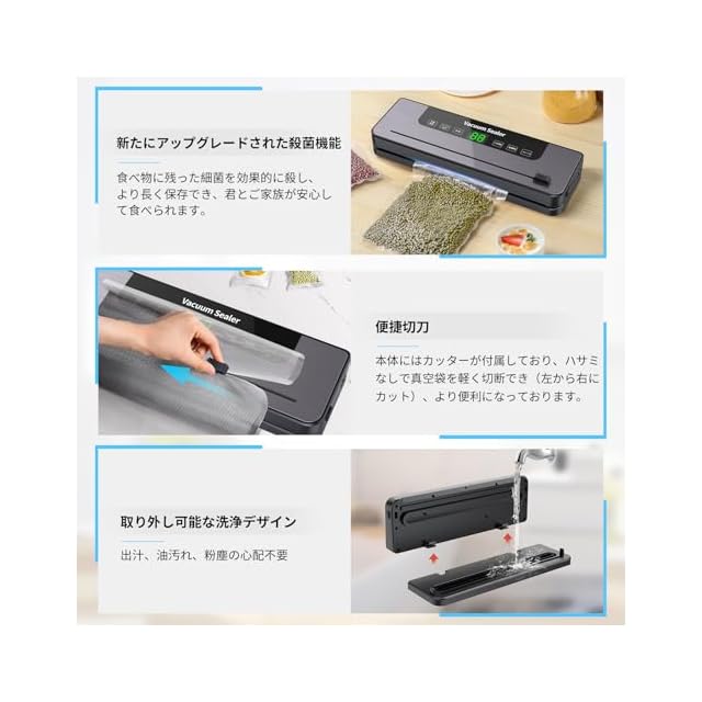 真空パック機 食品シール機 家庭用真空シール機【2024新発売-90 Kpa乾湿両用真空脱気シール機】シールパック機 真空保存 鮮度持ち 酸化防止 収納補助 マルチ 乾燥物/汁気物/お米/シールのみ/手動脱気/ストシプ コンパクト 冷蔵 冷凍 操作簡単耐久 軽量デザイン 低騒音 プレゼント <br> <br>【90kpaの強力な吸引力&様々な食品に対応可能】真空パック機は先進的な真空技術が採用され、吸引力は最大約90kpaに達し、短時間で真空にすることができます。これには手動脱気、シールのみ、お米、汁物、乾物(ドライ物)の5つのモードが搭載されています。肉類、魚、野菜、果物などの食品の新鮮さを保つことができ、お菓子、ナッツなどの乾食品(ドライ食品)の真空保存にも使用できます。湿気や埃を効果的に隔離し、食品の酸化や細菌の繁殖を防ぎ、食品の栄養と新鮮さを長期間保つことができます。君とご家族により健康で高品質な生活をもたらします。 <br> <br>※本製品には10個の真空パックが付属しています!