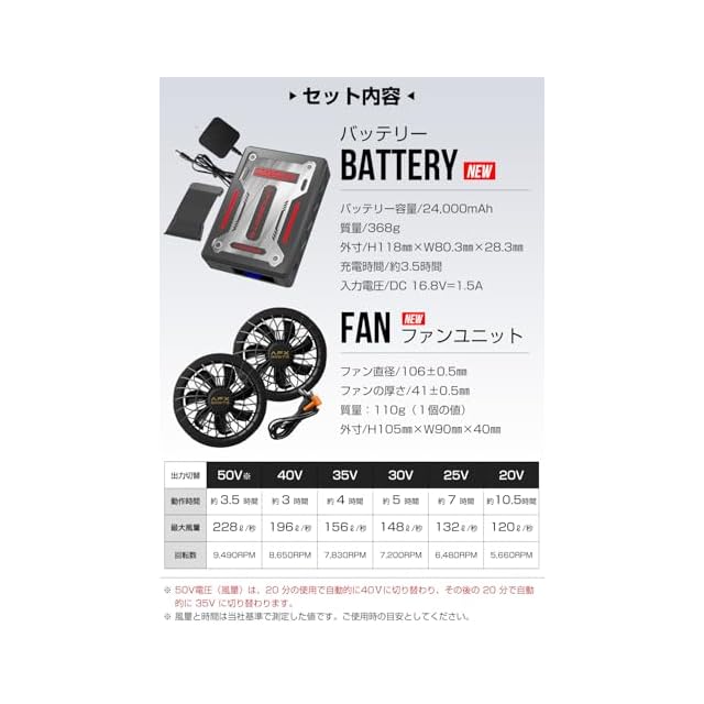 セット内容:ファン×2、バッテリー×1、充電器×1、ファン接続ケーブル×1、取扱説明書×1