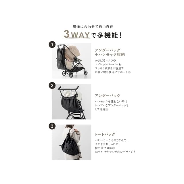 3WAY仕様でどんなシーンにも対応! ベビーカーの下部に装着するアンダーバッグとして使えるだけでなく、荷物が多いときはハンモック収納をプラスすれば、さらに大容量に。さらに、ベビーカーから取り外せばトートバッグとしても持ち運び可能。お散歩やショッピング、動物病院の通院、旅行など、さまざまなシーンで活躍します。「ベビーカーの収納スペースが足りない」「荷物をひとまとめにして持ち運びたい」そんなママの悩みを解決する、頼れるバッグです。