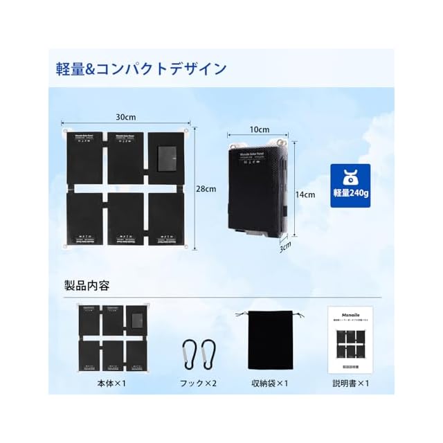 商品名:Msnaile ソーラーパネル 14W 折り畳み 小型 超軽量240g 携帯ソーラー充電器 太陽光パネル モバイルバッテリー ソーラーチャージャー 25%高変換効率 IP68防水防塵 2ポート搭載 Type-C出力 アウトドア/防災/緊急時用 ポータブル電源/iPhone全機種/Pad/Laptop/Android対応