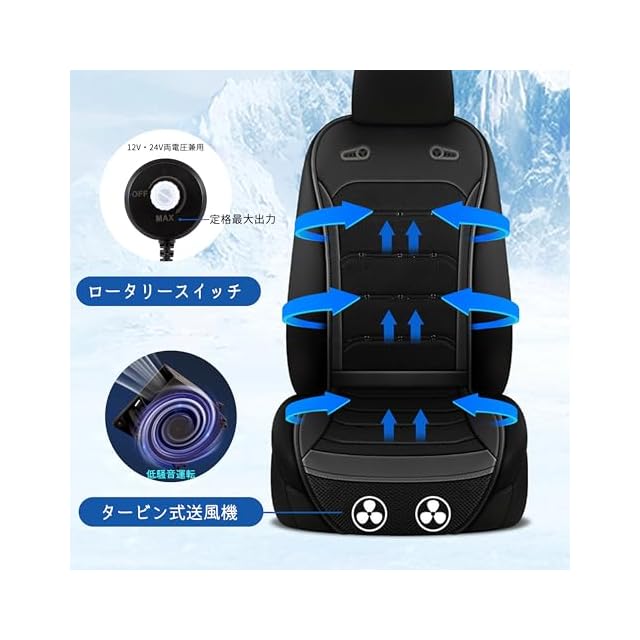 【双涡轮高速通風|8秒全域冷却×3段風量制御 2基高効率ターボファンをシート下部に内蔵。エアコン冷風を直吸収し、従来比2倍の送風量を実現。 峡谷型立体風路により、座面から背中まで8秒で均一冷却。弱・中・強の3段階調節で、炎天下の急冷から日常の快適維持まで対応。 【通気性抜群&快適なシート】 シートクーラーシートカバーは、厚手の3D立体メッシュ素材と多層空気孔デザインを組み合わせることで、以下の特徴を実現: 優れた通気性:気流循環を最大化し、長時間の運転でも蒸れを防止 高耐久設計:変形しにくい素材を使用し、長期間の使用でも形状を維持 【静音設計&多機能連携|30dB以下低騒音 タービン式DC静音ファンを採用(動作音図書館レベル)。 【デュアル電源対応|DC12V/24V+USB充電ポート シガーソケット接続で乗用車・トラック兼用 USBポート2口(最大5V/2.4A)搭載で、スマホと冷却シートの同時使用が可能 【10秒簡単設置|全車種対応 専用マットを掛けてシガーライター接続するだけ