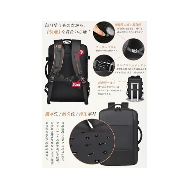 【40L大容量・機内持込】サイズ:49*33*14cm(拡張前:23L)/49*33*25cm(拡張後:40L);機内に持ち込み可能です。メイン収納部、PC収納ポケット及びフロントポケットも備える3wayリュックです。40Lメイン収納部はスーツケースのように開閉でき、出し入れが非常に簡単、最大4泊分の着替えも収納可能。荷物が少ない場合は、サイドのジッパーによりこのリュックをよりコンパクトにすることができます。<br>【4WAY 1つ4役 ビジネスバッグ】このビジネスバッグは、現代の多忙なビジネスパーソンのために設計された、非常に多機能なアイテムです。1つのバッグで4つの異なる使い方ができ、あらゆるシーンに対応します。4WAY仕様(リュック、横手提げ、縦手提げ、キャリ一オン)リュック対応:自転車での移動で手を空けたい時や荷物が重い時に楽々移動。横手提げ、縦手提げ対応:電車通勤や商談など、物をすぐに取り出したい時に便利です。キャリーオン対応:スーツケースのハンドルに固定できるベルトが付いているため、旅行や出張時に便利です。<br>【大容量·180°開口デザイン】大容量メイン室は、23Lのスーツケースと同等の容量を持ち、3泊4日分の荷物を問題なく収納できます。このメイン室はスーツケースのように180°開くことができ、荷物の整理整頓が非常に簡単になります。さらに、内部にはジッパーレイヤーが備え付けられており、荷物をしっかりと固定することができます。<br>【多ポケット・多収納設計 整理整頓しやすい】【トランク収納】広々としたメイン室には乾湿分類ポケットが付いており、乾いたアイテムと湿ったアイテムを分けて収納できるため、清潔に保つことができます。衣類や大型アイテムを十分に収納できます。【マルチ収納】使用頻度が高いものを入れるスペースとして設計されています。A4サイズの書類やファイル、ノート、ペットボトル、傘からペンケースまでたっぷりと収納できます。フロントコンパートメントには3つのジッパーポケットがあり、小物を整理して収納できます。【デバイス収納】17インチのノートパソコンを安全に収納できる専用ポケットがあります。複数のポケットが設けられており、使い勝手が非常に良いです。<br>【符合人間工学・チェストベルトを付く】伸縮性の高い通気性のあるバックパッド。快適で通気性のあるフォームパッドが空気循環を促進し、背中を継続的にドライに保ちます。チェストベルトを付く、バックパックや登山用具に付属している胸部分のベルトで、使用者の快適性と安全性を向上させるために設計されています。このベルトは、肩からかかる荷重を分散させることにより、長時間の使用でも疲れにくくする効果があります。<br>【環境保護・優れた防水性能】環境保護の観点から、表地には100%リサイクルプラスチック素材を使用しています。表面には耐久性が高い高密度オックスフォード防水生地を採用しており、雨がバッグの中まで浸透することなく、水滴や汚れも寄せ付けません。撥水仕様なので、電子機器や書類も安全に収納できます。さらに、この生地は防汚性と防刮性にも優れており、日常的な使用による小傷からあなたのアイテムを守ります。