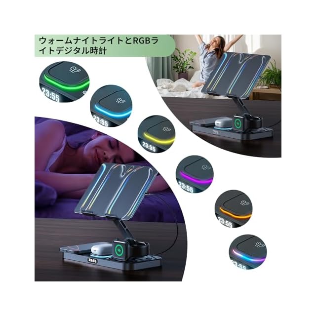 【ユーザーフレンドリーなデザイン】本製品は、デバイスが滑ったり、裏返ったりしないように滑り止めシリコンで設計されています。デバイスの充電状態を示すLEDインジケーターライトタ付き、充電状況を表示します。白いライトが点滅し、異物やデバイスが正しい充電位置にないことを知らせます。間違いなく完璧なナイトスタンド充電ステーションです。(iPad向けの充電状態を示すインジケータライトはありません)。
