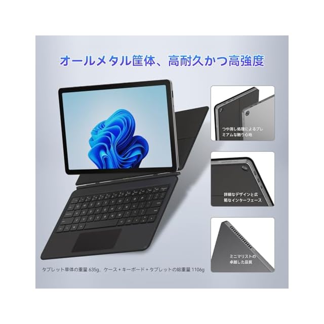 BNCF 2in1 タブレット、Windows 11 Proノートパソコン 11インチ、 13世代 Twin Lake N150 CPU、最大3.6GHz、12GB LPDDR5+256GB NVMe SSD、11" IN-CELL FHD IPS 1920x1200、5MP+8MPカメラ、Wi-Fi 6、BT 5.0、2xType-C、HDMI、英語キーボード+日本語キーボードカバー付き、全金属