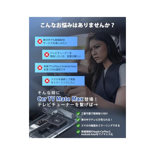 【Car TV Mate Maxご購入前に必ずご確認ください】基本的に2016年以降の有線CarPlay搭載車両のみ対応しています。無線接続可能なCarPlay搭載車両には対応していません。純正品以外の市販品カーナビやディスプレイオーディオには対応していません。BMWシリーズには対応していません。