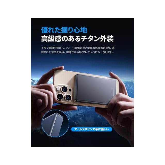 【チタン素材ならではの高級感】 このモバイルバッテリーは、高品質なチタン素材を採用し、環境にも配慮します。アノード酸化処理と電解着色技術により、落ち着いた色合いと上品な光沢を実現し、見た目だけでなく、触れた瞬間にも高級感を感じさせます。丸みを帯びたデザインが手にフィットし、快適な持ち心地を提供します。