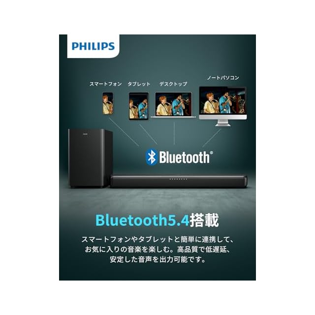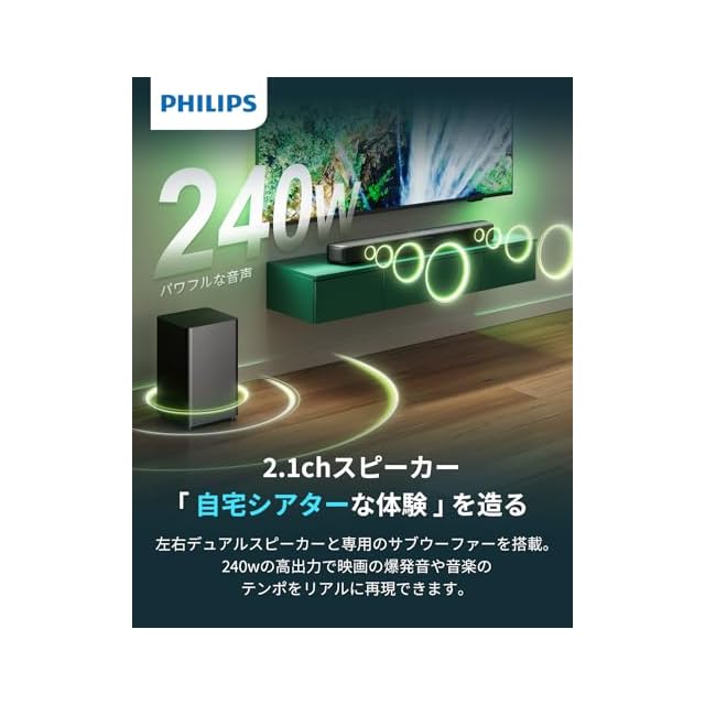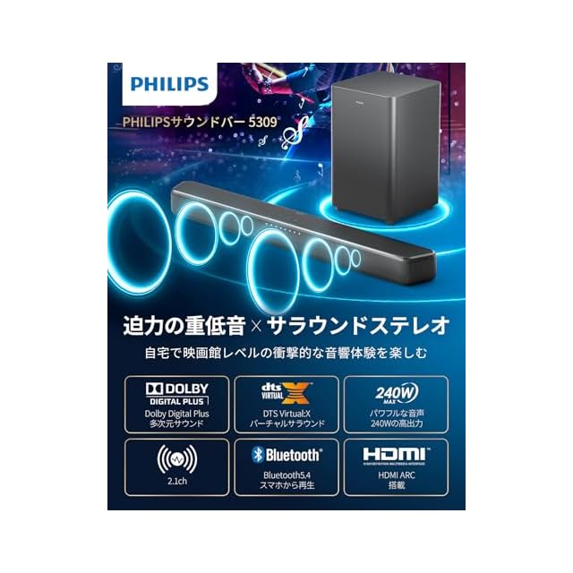 商品名:Philips(フィリップス) サウンドバー テレビ用 Bluetooth5.4搭載 スピーカー 240Wハイパワー Soundbar Dolby Digital plus DTS Virtual:X 立体音響技術 ワイヤレスサブウーファー付き リモコン付属 PC対応 ゲーム スピーカー テレビ/パソコン/スマホ HDMI TAB5309 (サブウーファー付き)