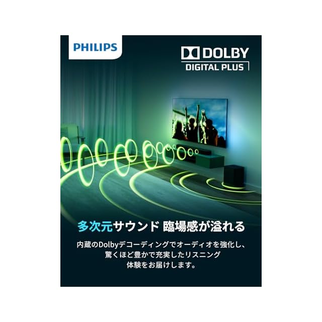 【映画館のような没入型サウンド】:PHILIPS サウンドバーは2つのユニットを内蔵で、バイネルスピーカーはステレオ効果を生み出し、空間に音楽のサラウンド分布を感じることができます。音楽をよりダイナミックに、思いのままに楽しむことができます。DTS Virtual:Xは広い3Dサラウンドサウンドを創造し、前面、左側、右側とサラウンドサウンドに高さを加え、より広く、より高く、より没入的なサウンド体験をお楽しみいただけます。雨や落雷、空中を旋回するヘリコプターなど頭上からのサウンドも的確に再現することで、アクション映画の視聴やテレビゲームのプレイに圧倒的な臨場感を与えます。