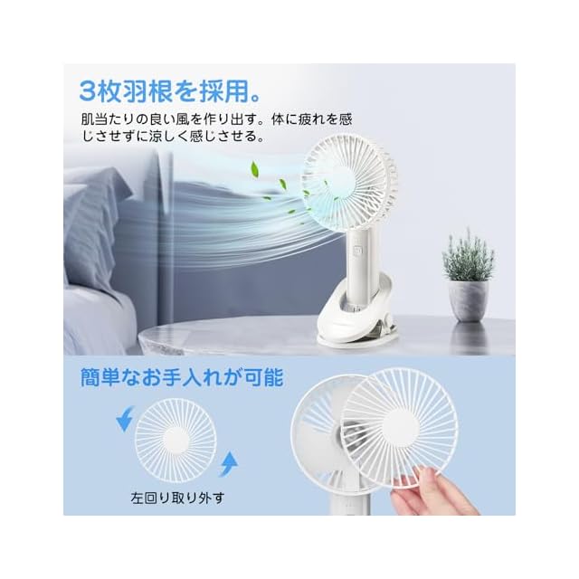 【2025年新登場1台4役扇風機】手持ち扇風機、卓上扇風機、壁掛け扇風機、スマホスタンドの4つの機能を兼ね備えています。デスク上に置けば卓上扇風機として使え、持ち歩けばハンディファンとして使えます。また、ファンとクリップを組み合わせることで、壁に掛けられる壁掛け扇風機にもなります。さらに、スマホを見たい時は、スマホスタンドとして使用することも可能です。 3 段階風量切替 & 3 枚羽根設計 & 超静音】携帯扇風機は弱・中・強の 3 段階の風量調節機能を搭載しており、使用時にはお好みに合わせて自由に風量を調節できます。この携帯扇風機は 3 枚の羽根を採用し、羽根全体を流線型デザインにすることで、効率的に風を集めることができます。最新の DC モーター技術を採用し、どんな時もさわやかな自然風を送り出します。静音性にもこだわって、自分にも周りの人にも迷惑をかけず、勉強や仕事に集中できる環境を提供します。 【5000mAh大容量バッテリー・最大14時間の連続使用】 一般の携帯扇風機の2倍の5000mAh大容量バッテリーを搭載。Type-C急速充電に対応し、パソコンや車載USB充電器、モバイルバッテリーから直接使用可能。3~4時間のフル充電で最大14時間の連続送風を実現。バッグや車に常備しておけば、いつでもどこでも快適な涼しさを手に入れられます。 【180度折り畳み式&洗いやすい】上下180度の角度調節が可能で、風を好きな方向に向けられます。更に、携帯扇風機の前カバーは簡単に取り外せるため、水洗いもOKでお手入れが楽々! 【安全重視 & 安心なアフターサービス】ハンディファンは爆発などのリスクを回避するために長い間テストを行い、安全な PCB 回路設計を採用し、独立なリチウム電池を採用し、過充電・過放電・短路を回避し、耐用年数を延長します。徹底した安全設計を施しました。また、使用中に何か分からない点があれば、お気軽に弊社までお問い合わせください。