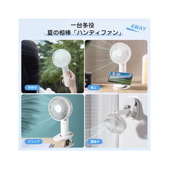 商品名:【2025革新型 -強力送風】 ハンディファン ホワイト 携帯扇風機 静音 4WAY (手持ち/卓上/壁掛け/クリップ) 5000mAh大容量 3段階風量調整 USB充電式 Type-C 対応 小型 ミニファン 花火大会/オフィス/アウトドアなどに適用 母の日 ギフト