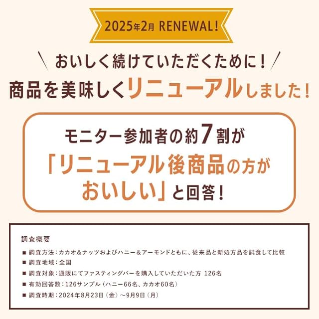 ・3食の食事のうち、いずれかの食事をファスティングバー1本に代えることで、手軽に16時間ファスティングを実施することができます。 ・食物繊維の豊富さと、ナッツの歯ごたえにより満足感があります。 ・ナッツを主体にはちみつでほのかな甘さをつけ、素材そのもののおいしさを引き出しました。 ・小麦粉不使用です。 ・100%植物由来の脂質により、ファスティングサポートPFCを実現しました。
