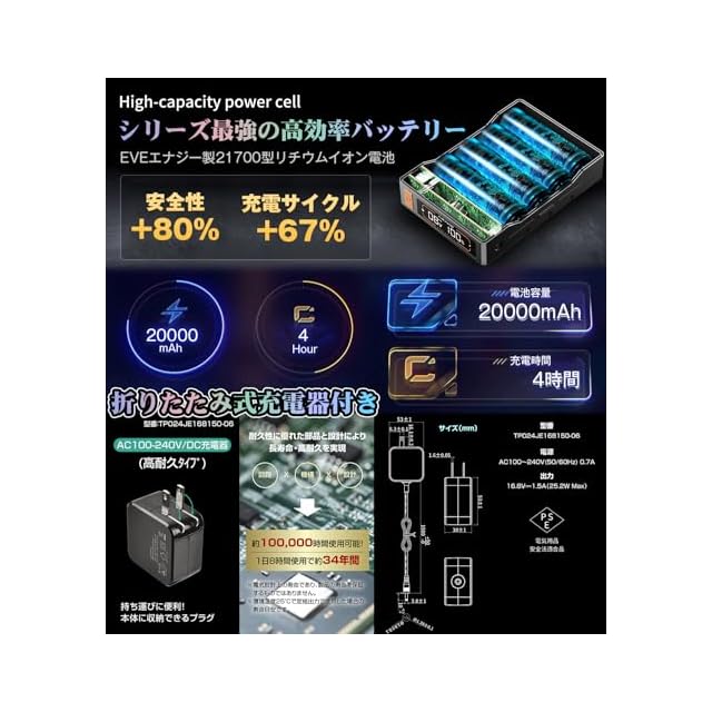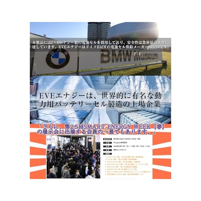 【高い安全性を実現】本製品にはEVEエナジー製の電池セルを採用しており、安全性は業界最高水準に達しています。EVEエナジーはドイツBMWの電池セル供給メーカーの一つです。一般的なリチウムイオン電池は、損傷時に発火のリスクがあります。しかし、EVEエナジー製の電池は、電池内部で発熱が発生しても、熱暴走や発火のリスクを大幅に低減する安全設計となっています。※EVEエナジーは、世界の動力電池搭載量で第4位にランクインしている上場企業です。