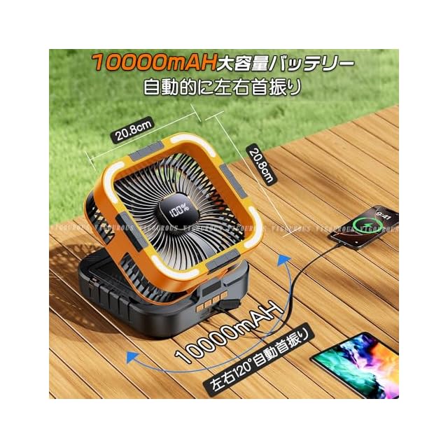 商品名:【2025年新登場!ソーラー充電/自動首振り】ソーラー扇風機 10000mAh USB充電 キャンプ扇風機 左右120°自動首振り ライト付携帯扇風機 6段階風 3段階LEDライト 4段階定時 テントファンア ハンドル付き アウトドア ランタン照明 卓上 キャンプ用 折りたたみ式 家用 屋外 オレンジ