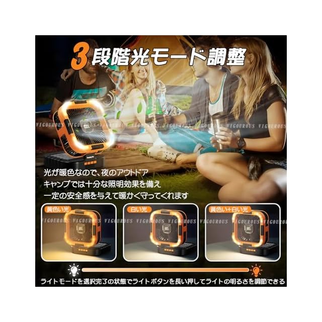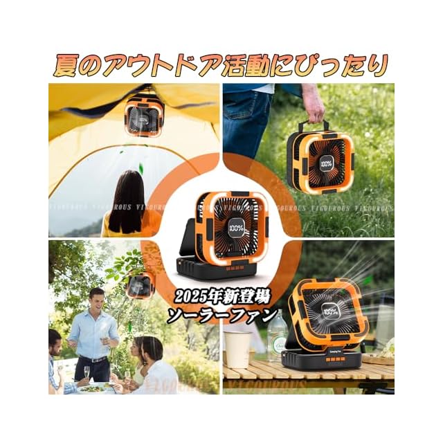 【アウトドア愛好家にとって最強のソーラー扇風機】【アウトドア愛好家にとって最強のソーラー扇風機】VIGOUROUSで生産した2025年最新のソーラー扇風機(大容量10000mAh)は大きな太陽電池パネルを搭載し、室外でソーター充電できます。5V/2Aの充電器で充電することもできます.。折り畳み可能なデザインで、持ち手が付いているので、旅行にとても適しています。折り畳み可能なデザインで、持ち手が付いているので、旅行にとても適しています。LEDライトとハンドルも付きで、キャンプライト、アウトドア扇風機、テントファン、ポータブル扇風機と壁掛扇風機として、キャンプでも、ピクニックでも、ビーチで一日を過ごすのでも、お客様のニーズに簡単に対応し、どこに行っても涼しく快適な時間を楽しむことができるので、アウトドア愛好家には理想的なキャンプ扇風機です。