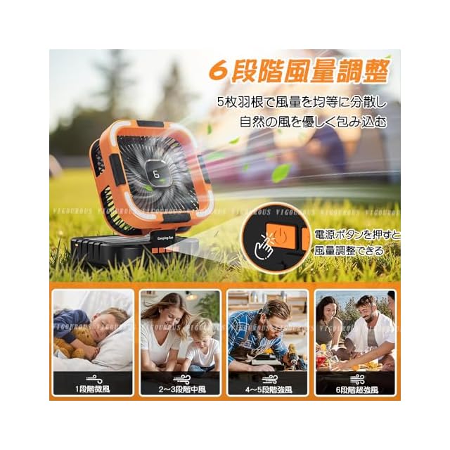 【6段階風量調節&具体的な電量表示】キャンプ扇風機は6段階の風量モードがあり、ニーズに応じて簡単に微風から強い風を選択することができます。屋外キャンプ用のファンとしてだけでなく、睡眠用の旅行用ファンとしても使用できます。*デジタル表示で、バッテリー残電量、風速がよりはっきり見えます。使用中は突然の電気停止の心配がありません。