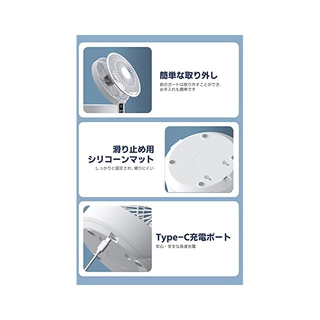 【Type-C充電式、壁掛け可能】最新のType-C充電で、コンパクトで使いやすく、家だけでなくオフィスやキャンプでも使用可能。バッグに直接収納できるので、旅行や引っ越しの際も便利です。壁掛けデザインも採用しており、フックがあれば壁に取り付けることができ、高い場所で使用すると部屋の空気循環がよくなり、部屋のすべての角により風を送ることができます。安全なグリッドデザインを採用しているため、指をファンの中に誤って入れてしまうことがなく、安心して使用できます。