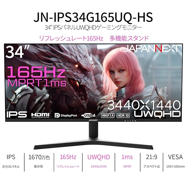 JAPANNEXT 34インチ IPSパネル搭載 165Hz対応 UWQHD(3440x1440)解像度 ウルトラワイドゲーミングモニター JN-IPS34G165UQ-HS HDMI DP HDR 1ms(MPRT) アスペクト比21:9 高さ調整 PBP/PIP 【2年】