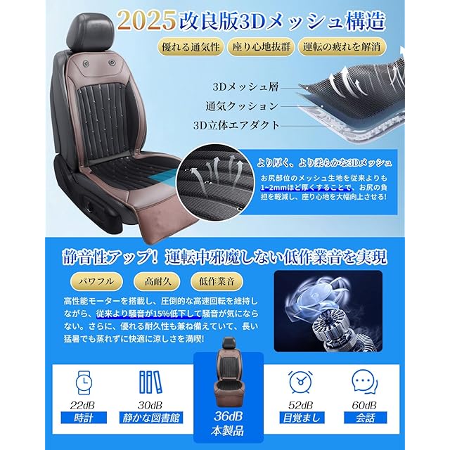 商品名:シートクーラー 車 クールシート 【2025年 2個大型送風機 無段階風量調整 DC12V/24V対応】 首元/背中/座面 42個通気孔 3Dメッシュ 冷風送風 低作業音 涼しい 蒸れない 通気性 快適ドライブ 滑り止め 取り付け簡単 熱中症対策 長距離運転 (ブラウン)