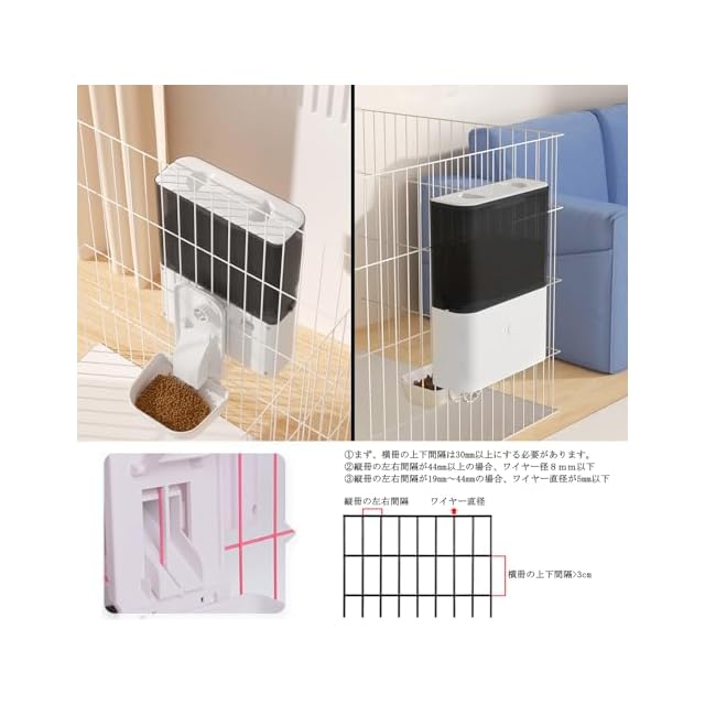 【ケージ取付】この自動餌やり機をケージにつけて、細身でスペースがとらないです。留守中に給餌器が転倒する心配がありません。噛み癖があるペットなら、この給餌器はケージ外側でほかの置く式給餌器より壊れにくいとおもいます。