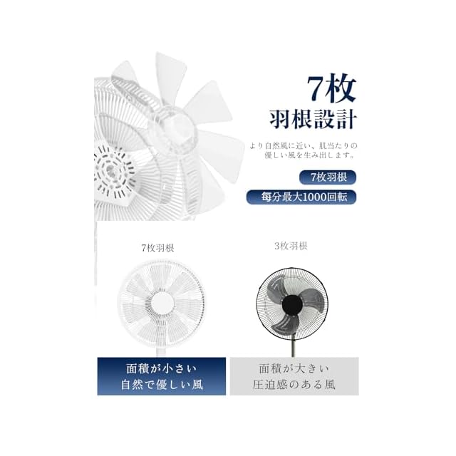 【7枚羽根の設計&超大風量】リビング扇風機は7枚羽根のデザインにより、空気を細かく分け、より均一で柔らかな風が生まれ、自然のそよ風のような心地よさを提供します。最大風速4.8m/sのパワフルな風を生み出し、遠くまで風を送り、お部屋の空気の循環にも活躍。暑い日には、涼やかな風をリラックスさせます。