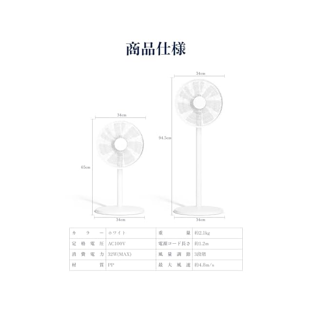 【商品仕様&安心サービス】寸法:W34×D34×H65.94.5cm・電圧:AC 100V・消費電力:32W(最大)・主要材質:PP・本体質量:約2.1kg・電源コード長さ:約1.2m・商品は初期不良があった場合、またご使用中に問題が生じた場合、いつでもお気軽に弊社までお問い合わせください。24時間以内に対応致します。
