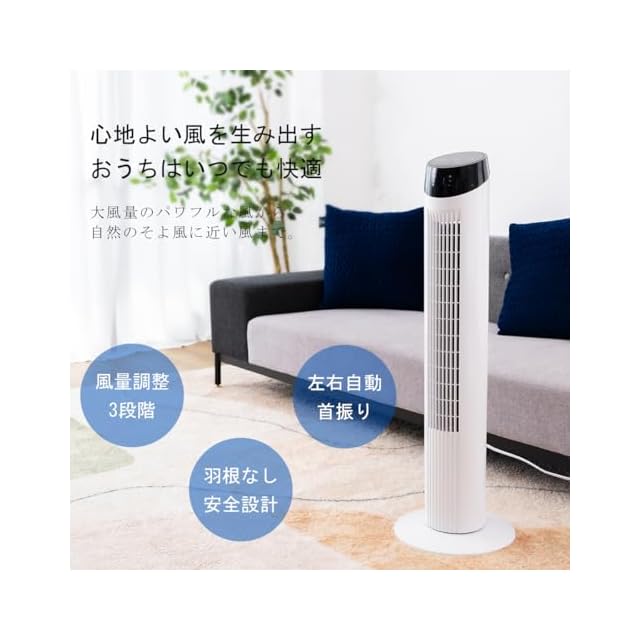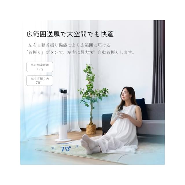 【扇風機より涼しい風&広範囲に涼しい風を届ける】高約さ90cmのスリムな設計で、ハイパワーモーターを搭載したタワーファンは、やさしい風からビューンと遠くに届く強風まで幅広い風速を実現、最大風速は7m/s!室内の暑さを素早く解消し、上から下まで快適な涼しさを提供します。これにより、夏の暑い日でも、部屋のどこにいても心地よく過ごせます。また、左右自動首振り機能を搭載しており、広い範囲をカバーしながら、効率的に涼しい風を届けます。高機能&高性能なリビングファンで、暑い時期をもっと快適に。