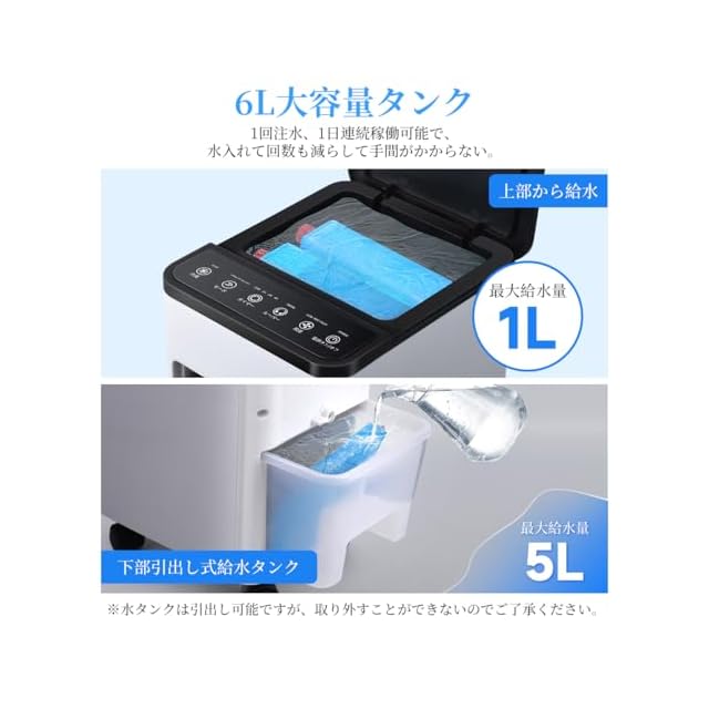 「2025年モデル 業界革新の6L大容量タンク搭載・1台4役の多機能冷風機」当店人気の冷風機は、タッチパネル式操作を採用。従来の機械式スイッチよりも直感的で洗練された操作感を実現しました。さらに業界トップクラスの6L大容量タンクを装備することで、面倒な給水作業を大幅に軽減。特許取得の上部給水方式により、中腰になる必要がなく、ご年配の方でもストレスなくお使いいただけます。さらに冷却性能を追求し、標準装備の保冷剤パック(2個)を給水口に設置可能。厳しい猛暑日でも持続的な冷却効果を発揮します。透明タンクの見やすい水位目盛りデザインにより、残水量がひと目で把握可能と、細部まで使いやすさにこだわりました。加湿・冷却・送風・空気清浄を兼ね備えた多機能冷風機です。