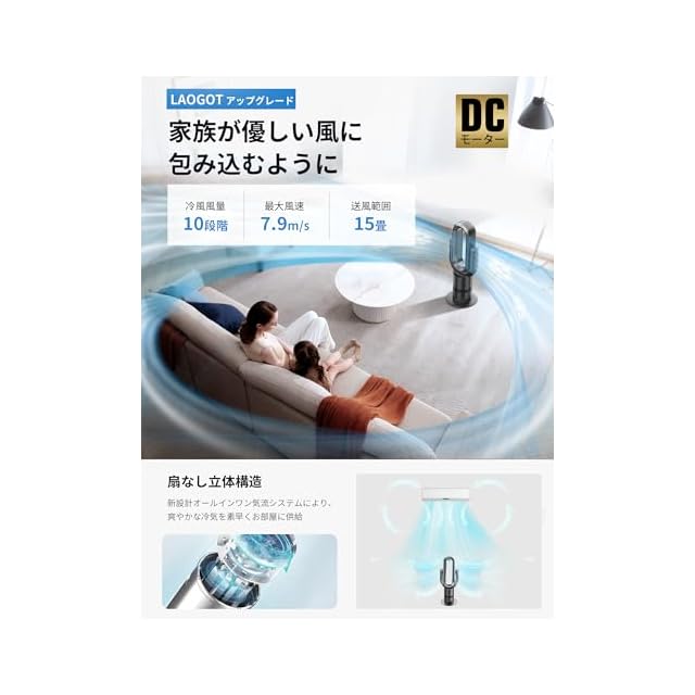 【四季を越えた快適をもたらす全天候設計】LAOGOTの羽なし扇風機は、高性能DCモーターを搭載し、低消費電力ながら高性能を実現し、優しい微風から遠くまで届くパワフルな風まで、10段階の多彩な風量を実現。夏の猛暑を乗り切る強力送風から、春や秋の過ごしやすい季節にぴったりの微風モードまで、1台でシーンに応じた快適さを提供。風の循環が良くなり、空気循環が改善され、より健康的で快適な生活環境を作り出します。タワーファン、扇風機、サーキュレーターの機能を兼ね備えており、季節の変化に柔軟に対応し、「夏は涼しく、冬は暖かく」を実現する、冷暖両用の羽根なしタワーファンです。※暖房時には3段階の温風設定、寒い冬にもゆったりと温まることができます。