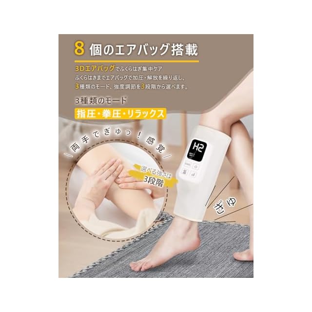 【3つのモード×3段階の強さ設定】空気圧式のエアバッグがふくらはぎ全体を優しく包み込み、加圧・解放を繰り返します。指圧・拳圧・リラックスの3モードを搭載。さらに、それぞれのモードに3段階の強さ設定が可能で、自分好みの心地よさを追求できます。