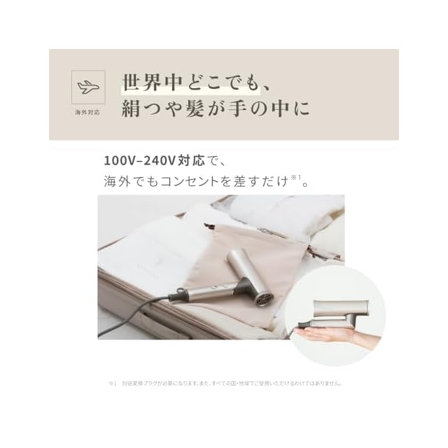 【世界中どこでも、絹つや髪が手の中に】 100V-240V対応で、海外でもコンセントを差すだけ。 ※別途変換プラグが必要になります。また、すべての国・地域でご使用いただけるわけではありません。