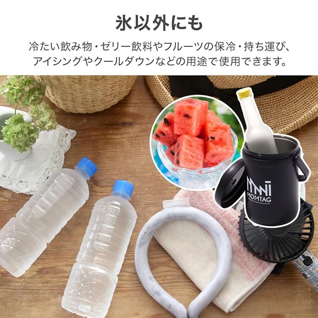 氷を入れる以外にも、冷たい飲み物の持ち運び・ゼリー飲料やフルーツの保冷/・アイシングやクールダウンなどの用途で使用できます。