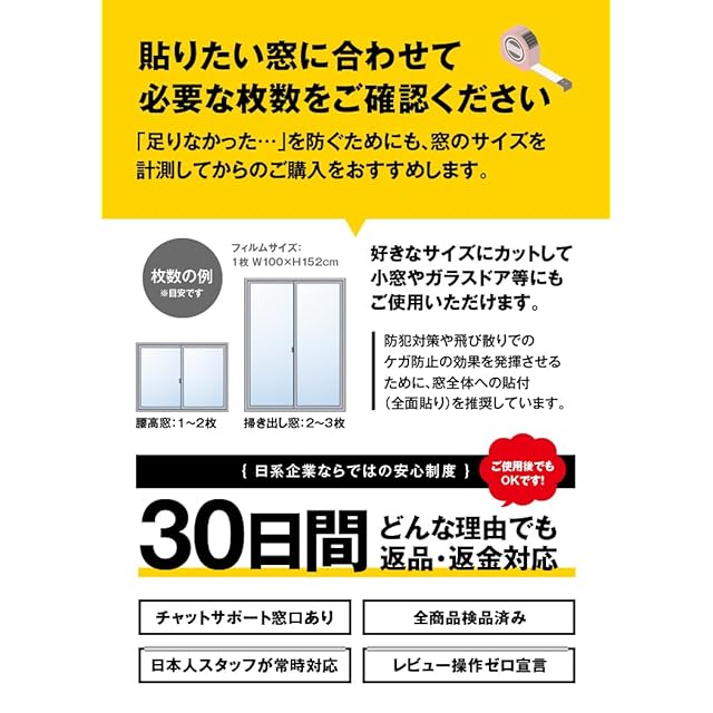 【空き巣対策の第一歩は窓から】空き巣の約7割が「窓ガラス破り」から侵入すると言われています。 本製品は、超厚300μm(0.3mm)の高強度PET素材を使用した、防犯専用の窓ガラス用フィルムです。