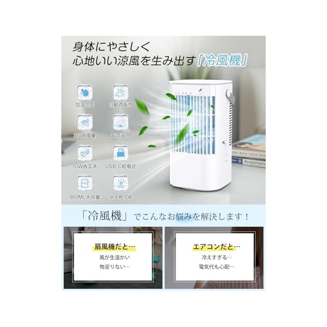 商品名:冷風機 冷風扇 強力【2025モデル・節電対策・首振り・USB給電式】超音波式 900ML大容量 小型 10W省エネ 冷風扇風機 卓上クーラー 細かいミスト 氷入れ可 噴霧 扇風機 送風 加湿 冷却 ミニクーラー ミニエアコン コンパクト 3段階風量 切タイマー LEDライト コンパクト 軽量 静音 オフィス 寝室 キャンプ用 熱中症と暑さ対策