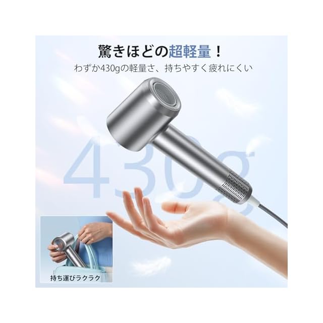 【超軽量&低騒音】このドライヤーは独自の静音技術で、空気の集中力を高め、風量を増加させると同時に動作音を50dB以内に抑え、超静音!新しい設計により小型化&超軽量化を実現。約430g(コードとノズルなし)の驚きの軽さで、長時間持っても疲れにくく、美容師にも好評です。コンパクトなサイズで場所を取らず、旅行や出張にも最適な持ち運びが可能です。【AIマート温度制御&二重安全保護機能】このヘアドライヤーはNTC温度検知チップとAI温度制御二重検知機能により、毎秒100回の温度検知して安定した温度をキープします。さらに、温度過昇防止装置も内部に配置され、安全・安心にお使いいただけます。