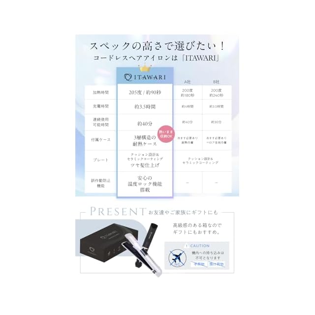 本製品は2025年5月にプレートのサイドにコームが付いている形状からコームレスの仕様へとリニューアルいたしました。2025年5月19日以降コームなしタイプに切り替わっております。 【表参道 髪質ケア特化サロン推奨モデル】美容師歴7年の美容師監修のもとどこでもサロン級のヘアスタイルを実現できるコードレスヘアアイロンを開発いたしました。嫌な湿気による髪崩れの悩みもこれ1台で解決します。 【速く軽い、どこでもサロン品質】セラミックプレートで均一に速く熱を作り出し時間がない場面でも活躍する最短55秒の立ち上がりの速さ。持ち歩きに最適な500mlペットボトルと同等の長さ21cm・およそ卵2つ分の重さ165gでコンパクト軽量モデル。耐熱性、断熱性に優れたケース付きで使用後冷まさず収納可能。 【優れた機能性】温度・充電が一目でわかる液晶デジタル表示。フル充電時、最大60分間使用できるので様々な場面で活躍。温度ロック機能で使用中押してしまう誤作動防止機能と安心な20分後自動電源Off機能搭載。 【均一な熱伝導】クッションプレートによって密度をあげプレート横のヘアブラシで髪を固定し熱を均一に伝えセラミックコーティングで滑りが良くスタイリングの時間を短縮でき髪への負担を軽減。 【2way仕様】ストレート・カールもその日の気分で思い通りのスタイリング。 【機内持ち込み不可】