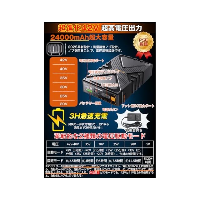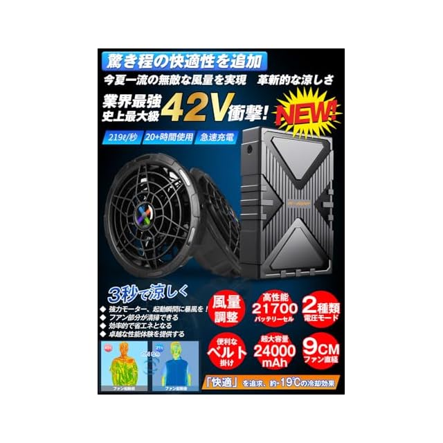商品名:2025革新設計 42V超高出力 ファンバッテリーセット 2種類駆動モード 作業服専用 急速充電器 9cmホール対応 熱中症対策 PSE認証済 日本語説明書