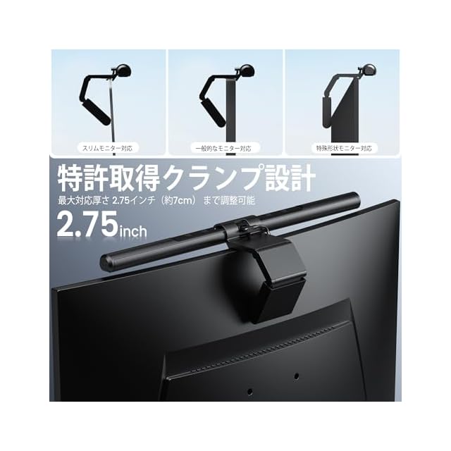 【モニター反射ゼロの光学設計で作業に集中】 特殊な非対称配光技術を採用しており、モニターの画面への反射を完全に防止します。これにより、画面の視認性が向上します。モニターの上部に簡単に取り付けることができ、デスク全体を均等に照らしながら、画面の明るさを均一に保ちます。長時間の作業やゲームにも最適で、集中力を高める明るさを提供します。
