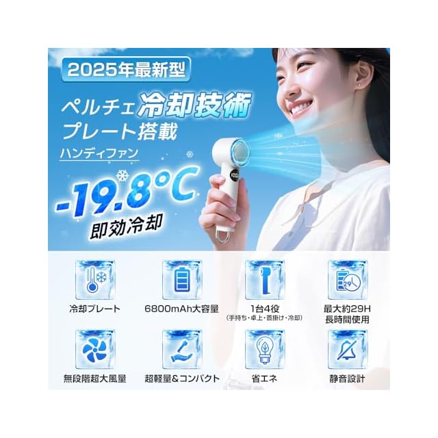 【ペルチェ冷却搭載・瞬間-17℃冷感体験】 2025年新モデル ハンディーファン が登場!この ハンディファン ペルチェ素子を活用した 冷却ファン で、最大-17℃まで冷やし、肌に直接ひんやりとした風を届けてくれる 手持ち扇風機 。暑さが厳しい日でも、瞬時にクールダウンできる ハンディ扇風機 です。本 携帯扇風機 は、 扇風機 小型 ながらもパワフルな送風力を持ち、手持ちとしてもデスクに置いても使える2WAY ハンディクーラー 。通勤・通学、アウトドアにもぴったりの 扇風機 ハンディ 。 熱中症対策 としても非常に有効な 冷却プレート付きハンディファン 。また、バッグに入れても邪魔にならないサイズ感の 小型扇風機 は、外出時の持ち運びにも最適な ハンディファン 首掛け 。この 冷却ファン は、今年の猛暑に欠かせない存在。高性能な 扇風機 小型 で、快適な夏を手に入れましょう。選ぶなら、冷却×携帯性×静音性のバランスが取れたこの ハンディーファン で決まり!