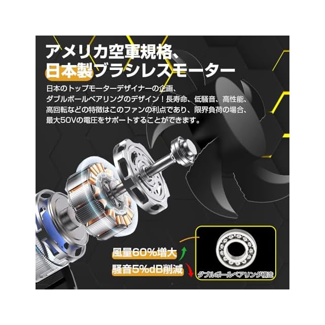 【Super Powerful!日本製ブラシレスモーター】風量増大と騒音低減を両立させるため、日本設計陣は高精度国産ブラシレスモーターを採用し、内部にダブルボールベアリングの構造があり、従来モデルのファンバッテリーセットと比較し、風量60%増大・騒音5%dB削減を実現しました。