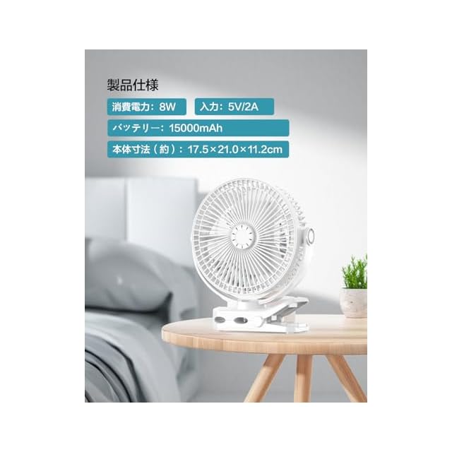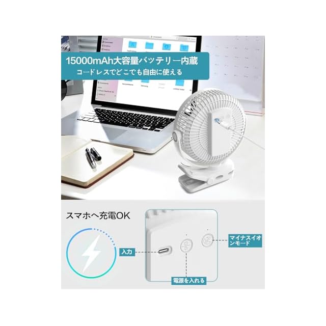 商品名:【360° 自動首振り・15000mAh 電池】20cm 大口径充電式クリップ扇風機 57 時間連続使用 USB 給電 風量 4 段階 防蚊香りケース マイナスイオン リモコン付き LED ライト 真静音 卓上/車載/キャンプ対応 空気循環機能 日本語取扱説明書(ホワイト)