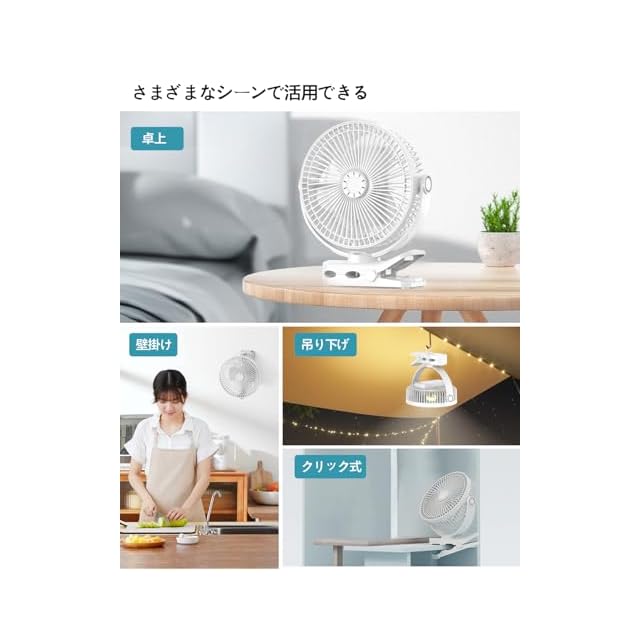 【3WAY 設置設計空気循環扇 × 多シーン対応】卓上置き、クリップ留め(ベッドやベビーカーにも対応)、壁掛けの 3 通りの設置方法が選べます。20cm の大口径ブレードで、車内、オフィス、アウトドアなど、あらゆるシーンで熱中症対策と空気循環にご活用いただけます。