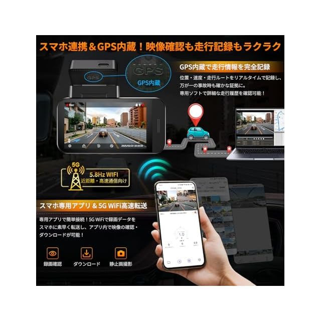 【5G WiFi&専用アプリ連携–スマホで映像をリアルタイム確認&転送】5G WiFiに対応し、スマホと瞬時に 接続のスマホ連携ドライブレコーダー!専用アプリ(iOS/Android)を使用して、ワンタップで録画映像をリアルタイム確認・保存。SDカード不要で、ワイヤレスで映像を管理可能。事故時には、その場で映像を保険会社に提出できるので、スムーズな手続きが可能に!さらに、家族や友人と映像をシェアするのも簡単!※PC側GPS再生ソフトのダウンロードリング:https://pormido.co.jp/pages/player