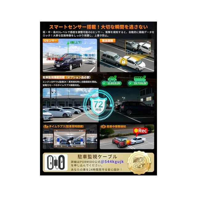 【Gセンサー&GPS内蔵–事故記録・走行ルート確認・駐車監視対応】◆【GPS内蔵】により、走行ルートや速度情報を記録し、専用ソフトで確認可能。万が一の事故やトラブル時に、正確な位置情報を証拠として提供。◆【駐車監視機能】にも対応し、衝撃を検知すると自動で録画を開始し、当て逃げや車上荒らしの決定的瞬間を記録。タイムラプス録画機能により、駐車中の状況を長時間監視でき、不審者の動きや周囲の変化を逃さず記録。エンジン停止後も愛車を24時間見守ることが可能!(※オプションの駐車監視ケーブルが必要)