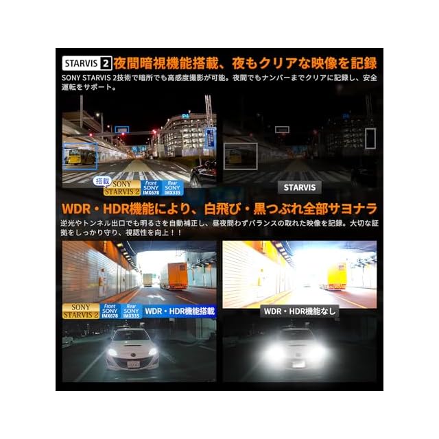 【STARVIS 2&WHD/HDR搭載–夜間や逆光でも鮮明録画】最新のSTARVIS2技術を採用し、従来モデルと比較して夜間映像の明瞭度が2倍向上!暗所でも細部までしっかり捉え、夜間走行時の安全性を大幅に向上。HDR/WDR補正機能により、逆光やトンネル内、ヘッドライトの強い光にも対応。さらに、【露出度調整機能】を搭載し、明るさに応じて最適な映像をリアルタイムで記録。夜間の無灯火道路や暗い駐車場でもナンバープレートや標識をはっきりと撮影可能!