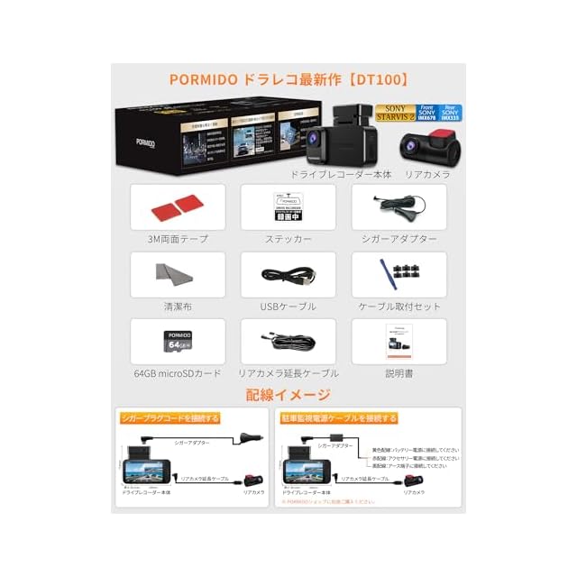 商品名:PORMIDO【業界最高峰 4K+2K 超高精細画質】ドライブレコーダー 前後カメラ【ソニー製830万画素IMX678 & 370万画素IMX335センサー搭載の小型ドラレコ】STARVIS 2+HDR/WDR 昼夜クリア録画【夜間無灯火・豪雨・逆光対応】5G WiFi&スマホ連携 GPS内蔵 Gセンサー 駐車監視 170°超広角 全国LED信号機/地デジノイズ対策 技適取得済み品 DT100