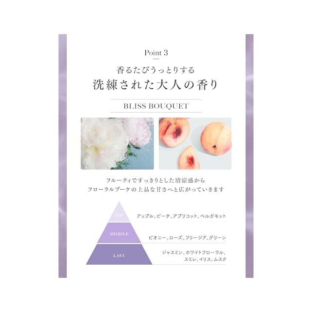 ✨【 洗練された大人の香り ~フルーティ・フローラル~ 】□TOP:アップル・ピーチ・アプリコット・ベルガモット □MIDDLE:ピオニー・ローズ・フリージア・グリーン □LAST:ジャスミン・ホワイトフローラル・スミレ・イリス・ムスク