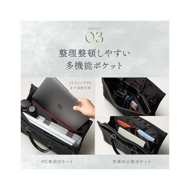 ✅ 3. ノートPCも安心収納(13.3インチ対応) 専用のPCポケットがあり、13.3インチまでのノートパソコンをしっかり収納。資料やファイルもすっきり収まり、面接・出張・外出時にも安心です。