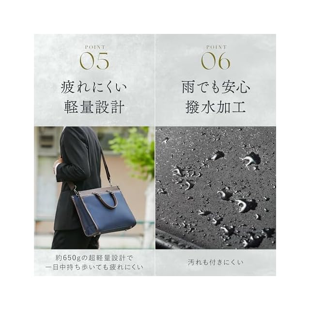 ✅ 5. 急な雨でも安心、撥水加工+2WAY仕様 撥水加工された生地が雨から大切な中身を守ります。さらに、シーンに応じて手持ち・ショルダーが選べる2WAY仕様で、通勤や外回りにも便利です。