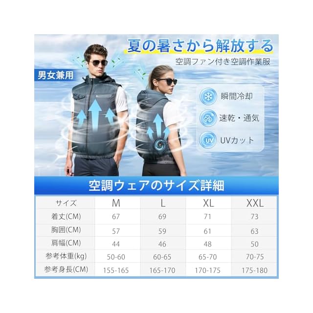 【3D循環送風・高品質ベスト・通気性抜群】まだ手に入れるベストの品質が悪い、仕上がりが粗い、縫い目が乱雑なことが心配ですか?こちらの高品質ファン付き空調ファンベストをぜひご覧ください。この作業服 ベストは100%ポリ工ステルとチタンコーティング裏地を採用し、縫い目がきちんとしていて、生地の微細孔があり通気性が良く、汗をかいてもすぐに乾きます。UVカット機能と撥水加工を兼ね備えた、90%の紫外線・赤外線をカットし雨にも強いです。直立ネックラインと取り外し可能帽子デザイン、背中から首元、頭にかけて心地よい風を通し、3D換気効果を高め、左右の腰の辺りに取り付けられたファンを用い、衣服の中に外気を取り入れ、体の表面に大量の風を流すことにより汗を蒸発させ、体を瞬時に冷やし、全身を清涼感で包みます。夏の猛暑を忘れてしまうほどの快適な涼しさを得られます。